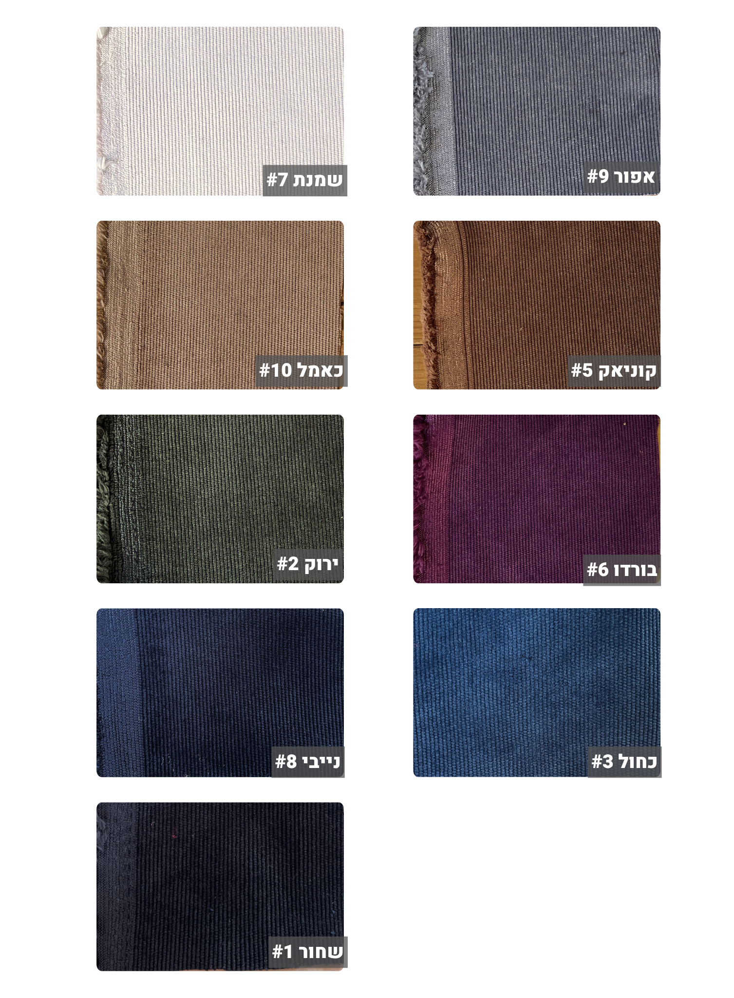אריג קורדרוי קלאסי בגוונים חלקים וחמים. מתאפיין במגע רך ונעים, נפילה עדינה ומעט יציב. מומלץ לפרטי לבוש קלאסיים, מחויטים או צמודים כגון ז'קטים, מכנסיים בשלל גזרות, שמלות, חצאיות ומעילים קלים. מומלץ לעונת המעבר והחורף.