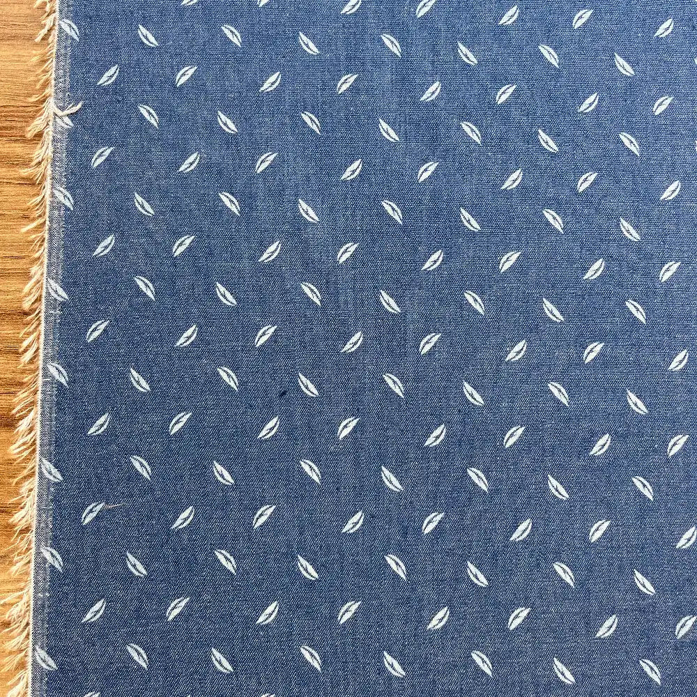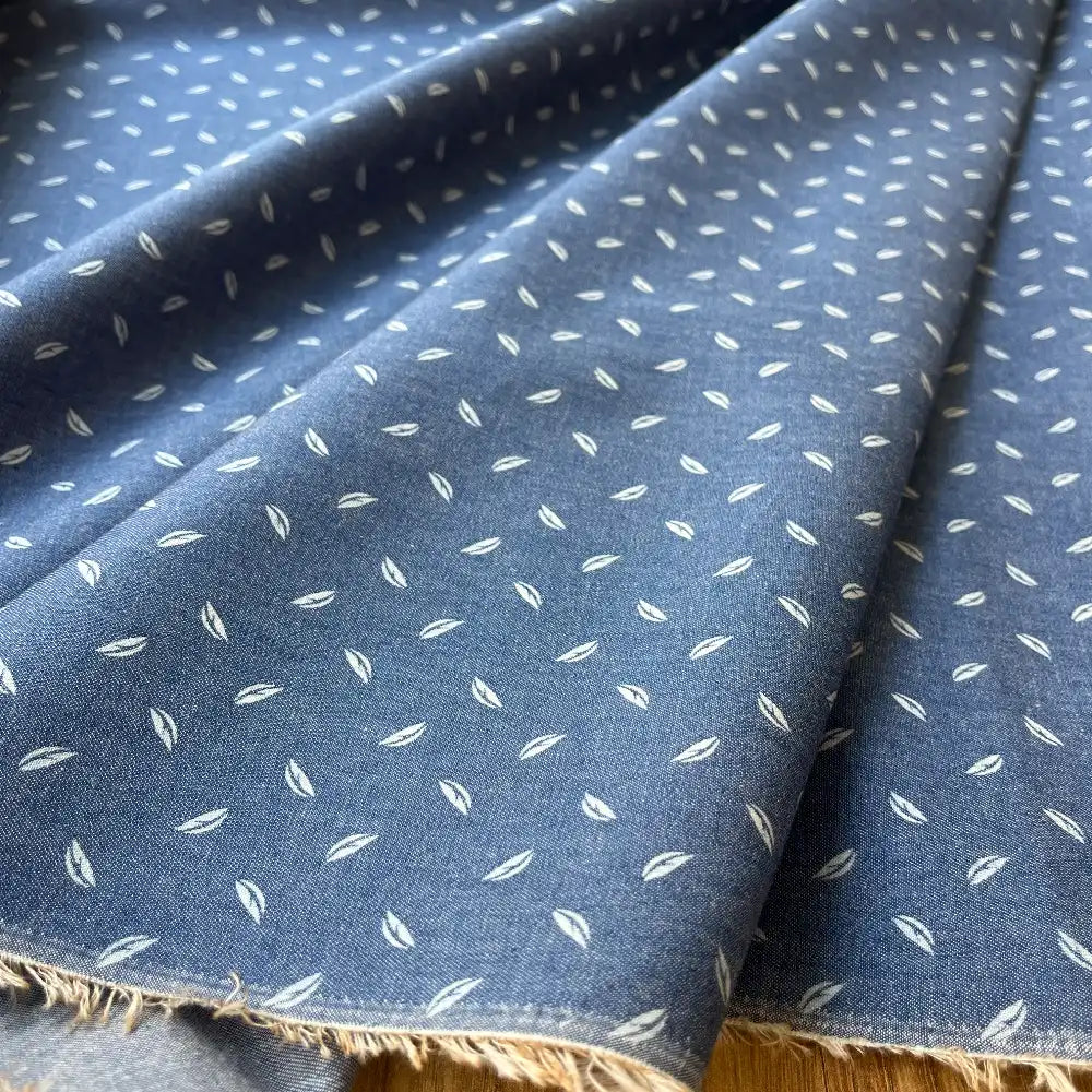 אריג כותנה בעובי בינוני, מדמה דנים קליל, אוורירי ורך, בהדפס עלים קטנים מסודרים בפיזור אחיד וחוזר.