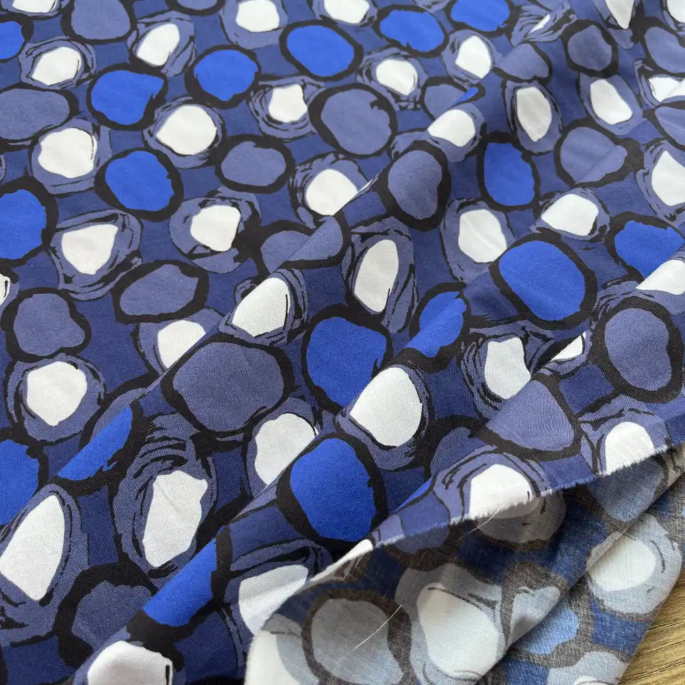 אריג כותנה בעובי בינוני, בהדפס גאומטרי אמורפי של עיגולים/כתמים בגווני כחול ורויאל. מתאפיין בסגנון מופשט, ביציבות עדינה ומגע נעים.