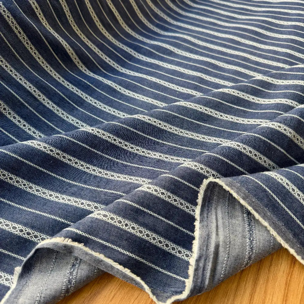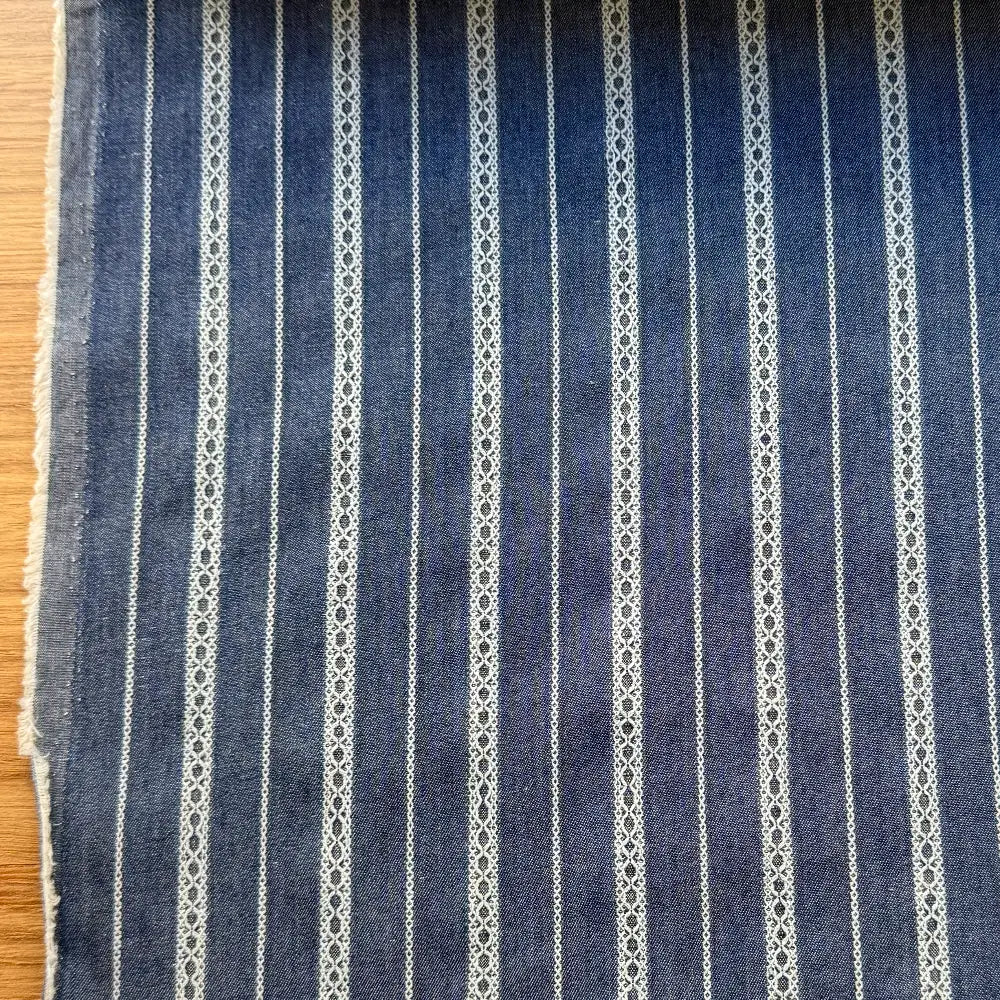 אריג ג'ינס דק בטקסטורת שורות רקומות בסיגנון שרשראות. מתאפיין במגע נעים ויציבות עדינה עם תנועה. מומלץ לפקטי לבוש קלילים במראה ג'ינס גגון שמלות, חצאיות, מכנסיים עם גומי וחולצות מכופתרות.