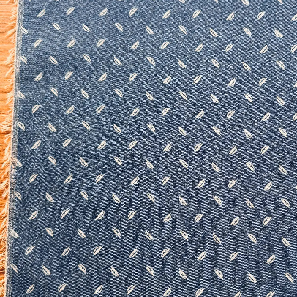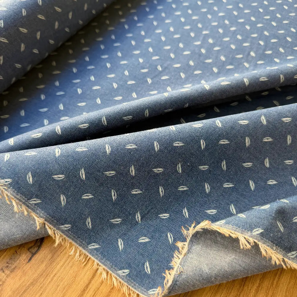 אריג ג'ינס דק בהדפס עלים קטנים בגווני לבן על רקע ג'ינס. מתאפיין במגע נעים ויציבות עדינה עם תנועה. מומלץ לפרטי לבוש קלילים במראה ג'ינס גגון שמלות, חצאיות, מכנסיים עם גומי וחולצות מכופתרות.