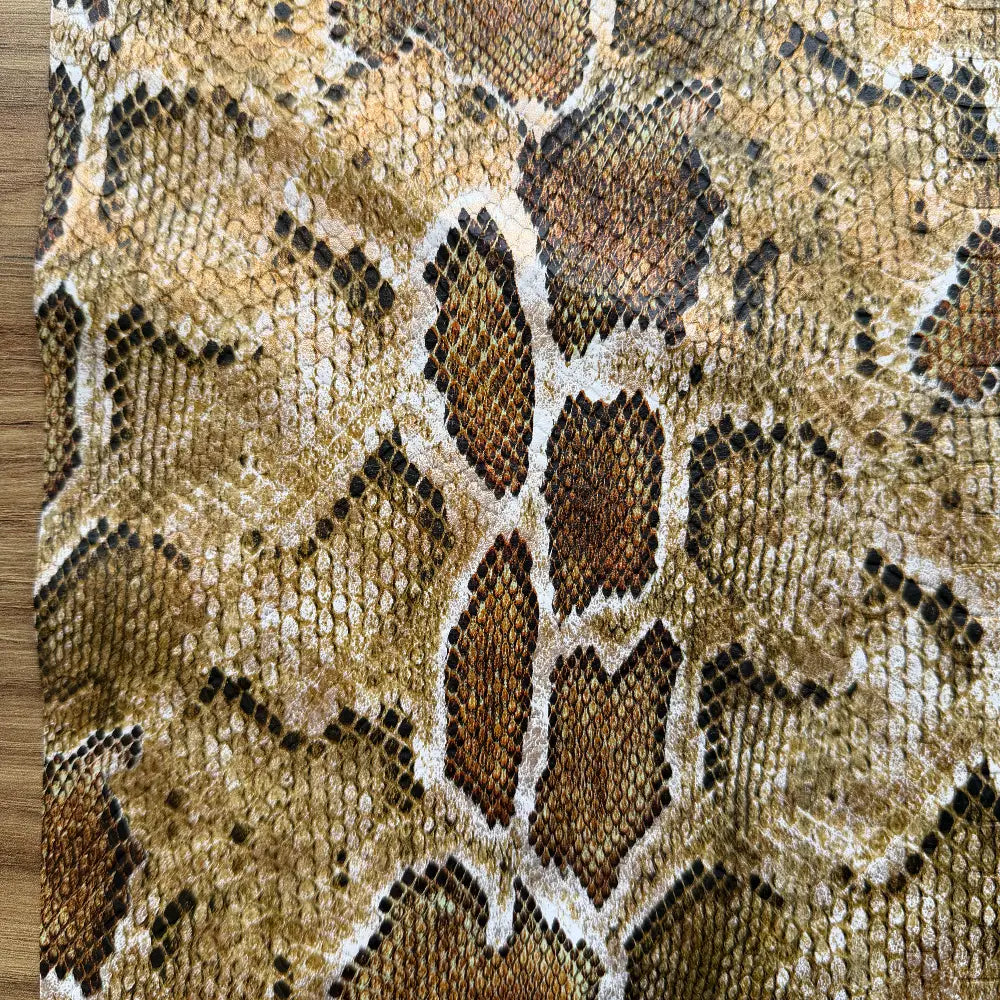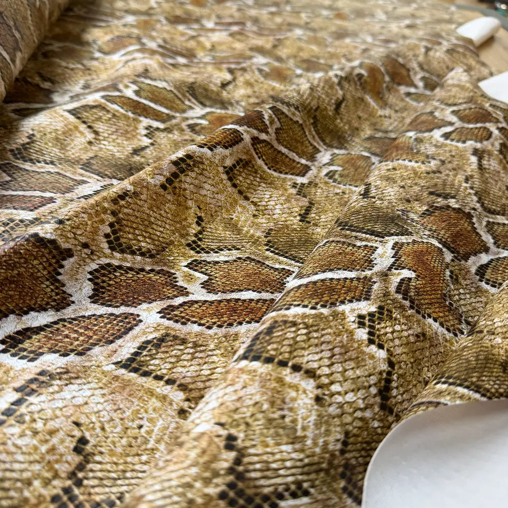 אריג דמוי עור בהדפס נחש חום. מתאפיין במגע חלקלק ויציבות עדינה. מומלץ לפרטי לבוש מחויטים, ישרים, בעלי נפח או נמתחים כגון חצאיות, מכנסיים, ז'קטים ומעילים.