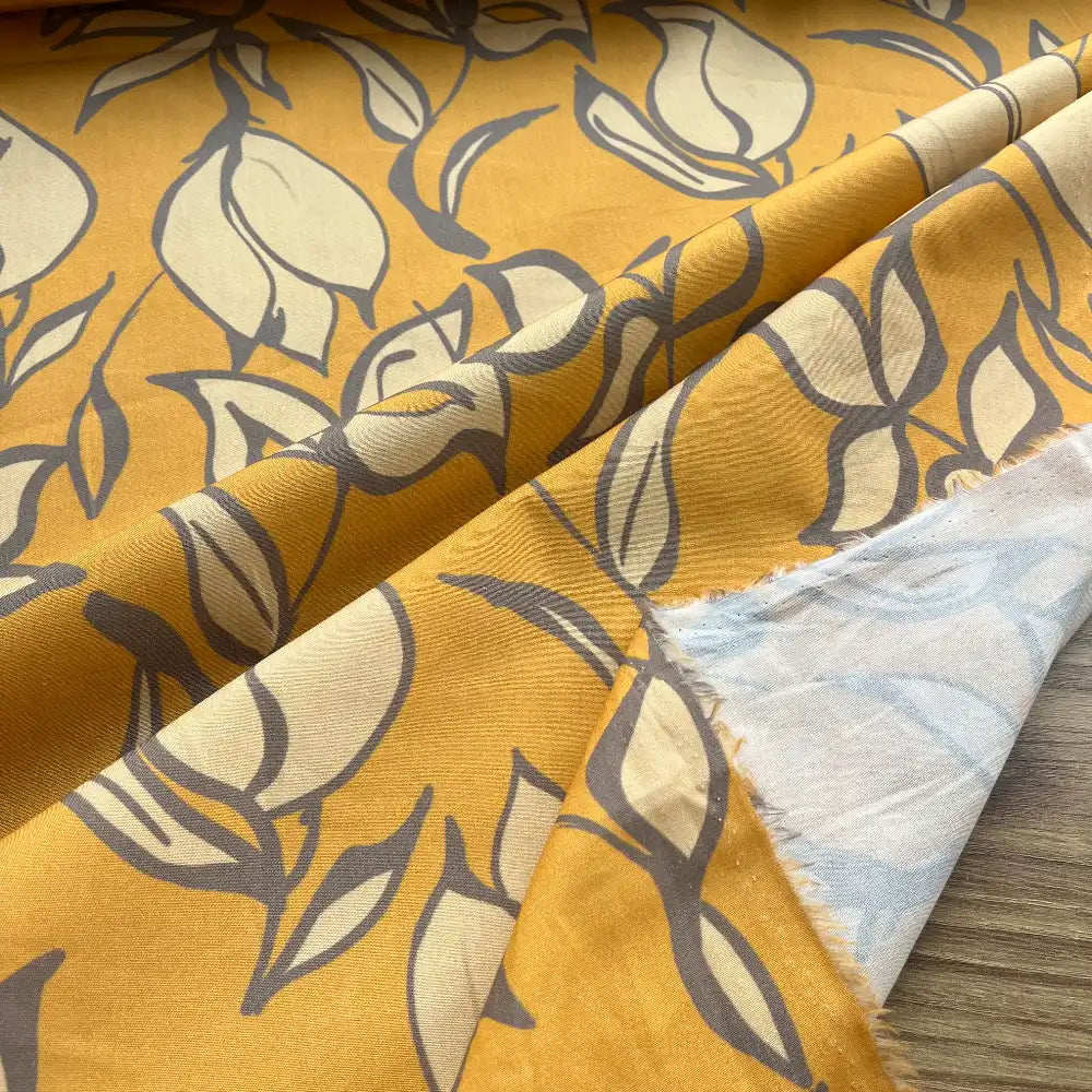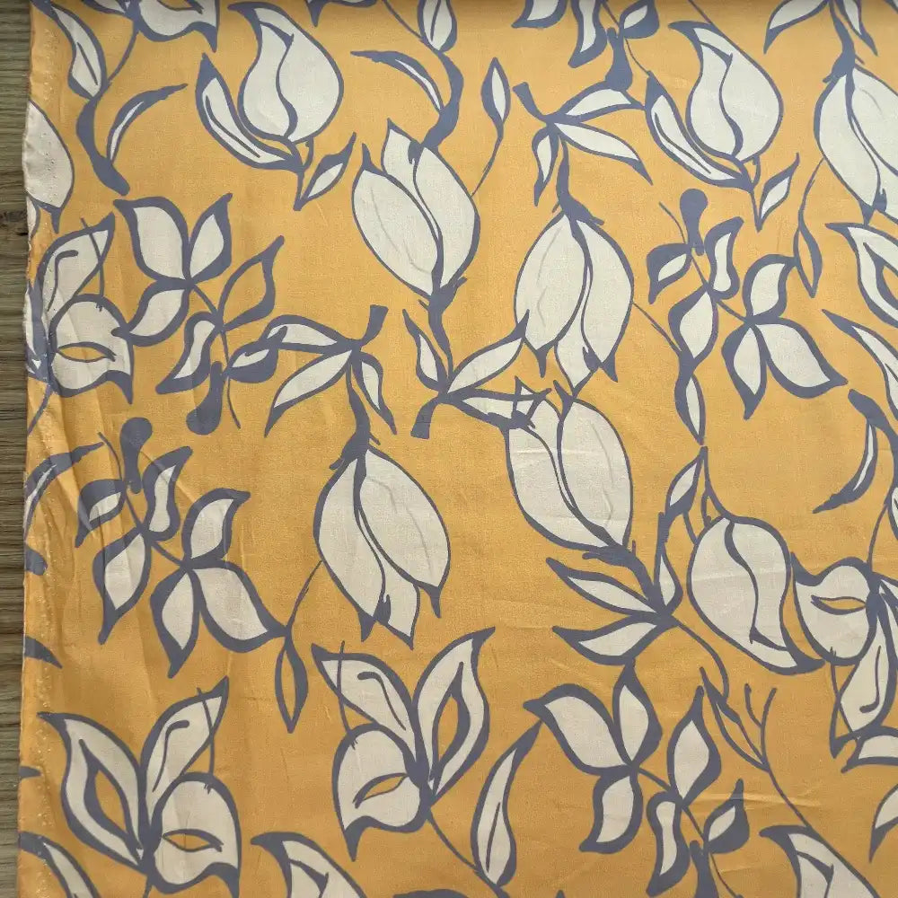 אריג כותנה בעובי בינוני, בהדפס פרחים ועלים גדולים על רקע כתום חרדלי עשיר וחם. מתאפיין במראה טרופי ובוהמייני, יציבות עדינה ומגע נעים מאוד.