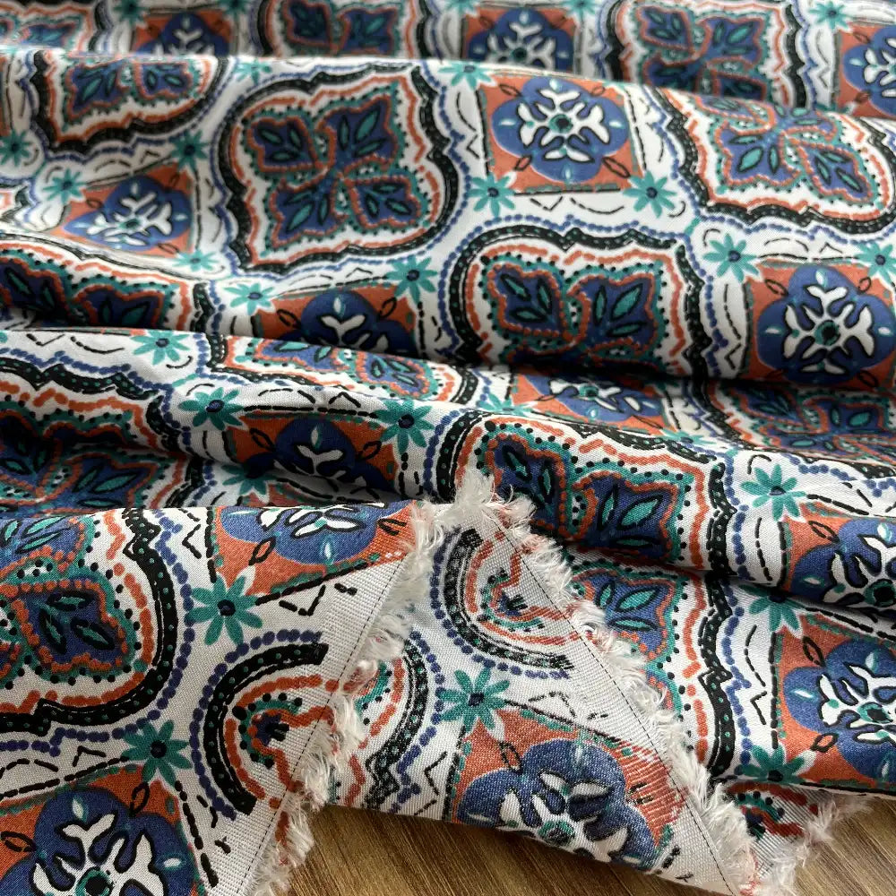 אריג כותנה בעובי בינוני, בהדפס חוזר של צורות המזכירות אריחי קרמיקה ספרדיים עם מסגרות גאומטריות ואמצע פרחוני בגווני כחול, כתום חלודה, טורקיז עדין ושחור. מתאפיין בניחוח אתני מלא חיים, יציבות עדינה ומגע נעים מאוד. מומלץ לפרטי לבוש ישרים או רחוקים מהגוף כגון חולצה מכופתרת, שמלות וחצאיות ישרות או עם כפלים ומכנסיים עם גומי.