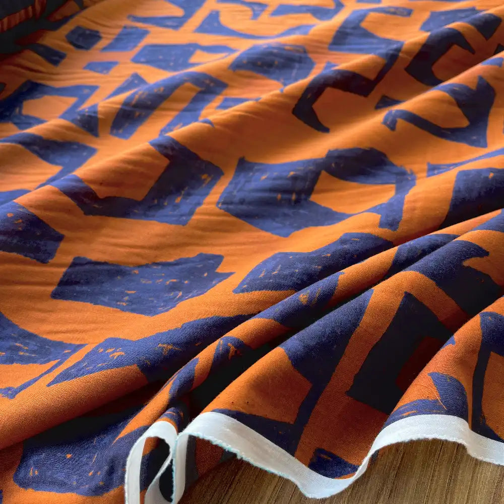 ווהל כותנה בעובי דק ושקפקף, בהדפס צורות גאומטריות גדולות בצבע כחול עמוק, בסגנון שנראה כמו משיכות מכחול על רקע כתום. מאתפיין ביציבות עדינה וקלילה ומגע מאוד נעים ורך. מומלץ בעיקר לפריטי לבוש ישרים או רחוקים מהגוף כגון שמלות וחצאיות עם כפלים, חולצה מכופרת ומכנסיים עם גומי.