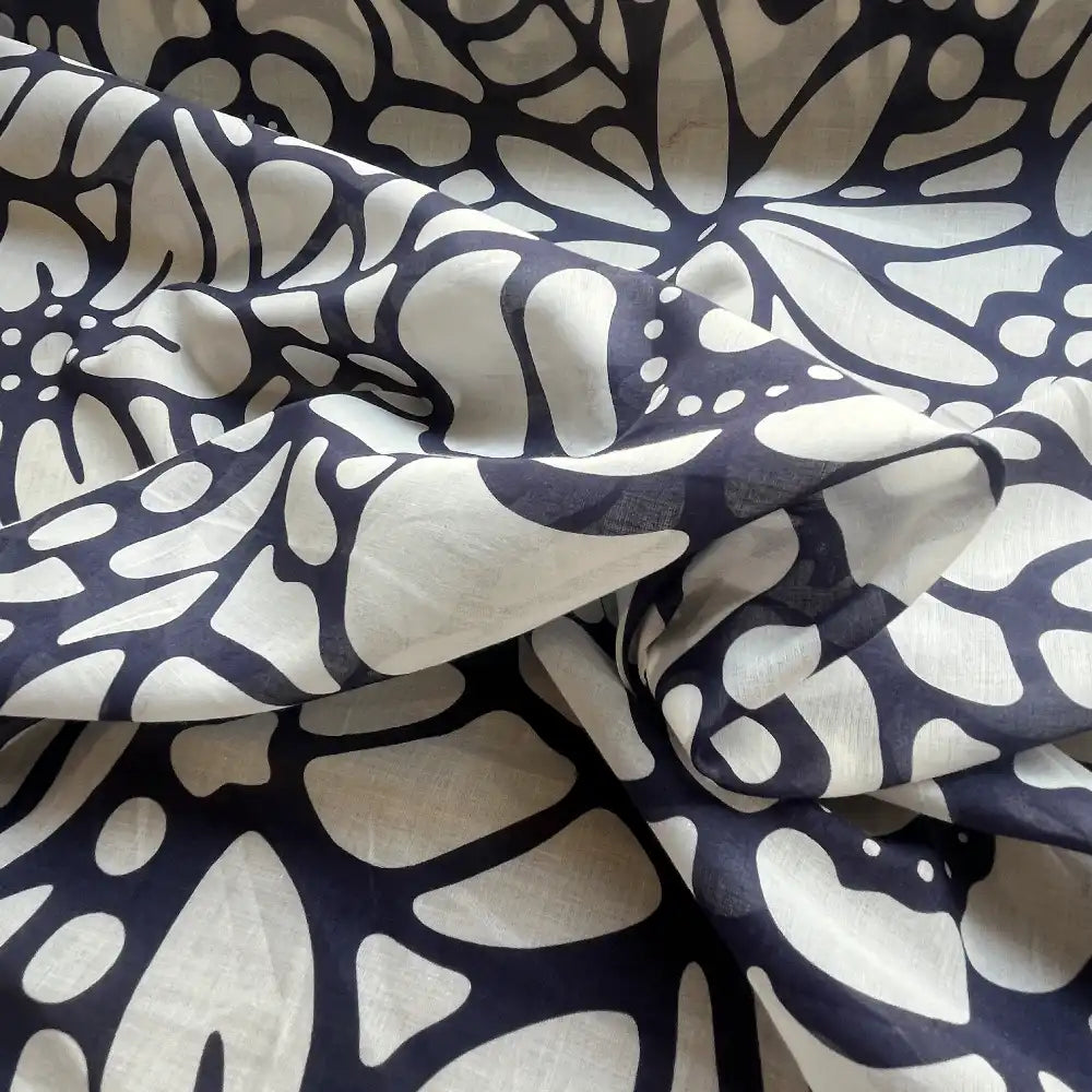 אריג כותנה בעובי דק ושקפקף, בהדפס עיגולים אמורפיים בגווני לבן על רקע כחול.