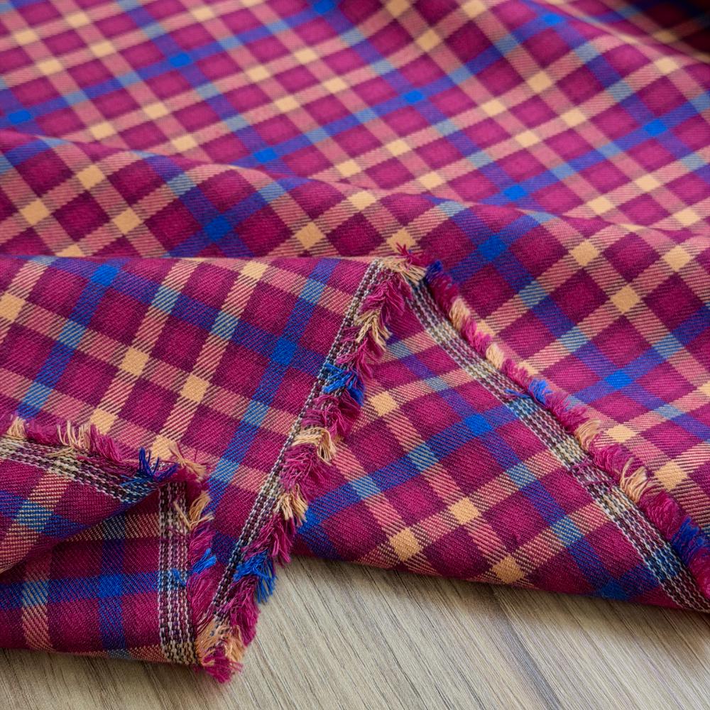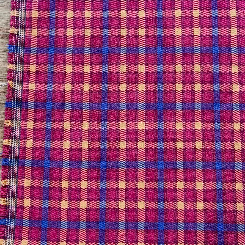 אריג כותנה פלנל משובץ בגווני דובדבן וכחול רויאל. מתאפיין במגע נעים ומלטף ויוצר תחושה חמימה בגוף. מומלץ לפרטי לבוש ישרים עם תנועה כגון חצאיות ושמלות בשלל גזרות, מכנסיים עם גומי וחולצה מכופתרת.