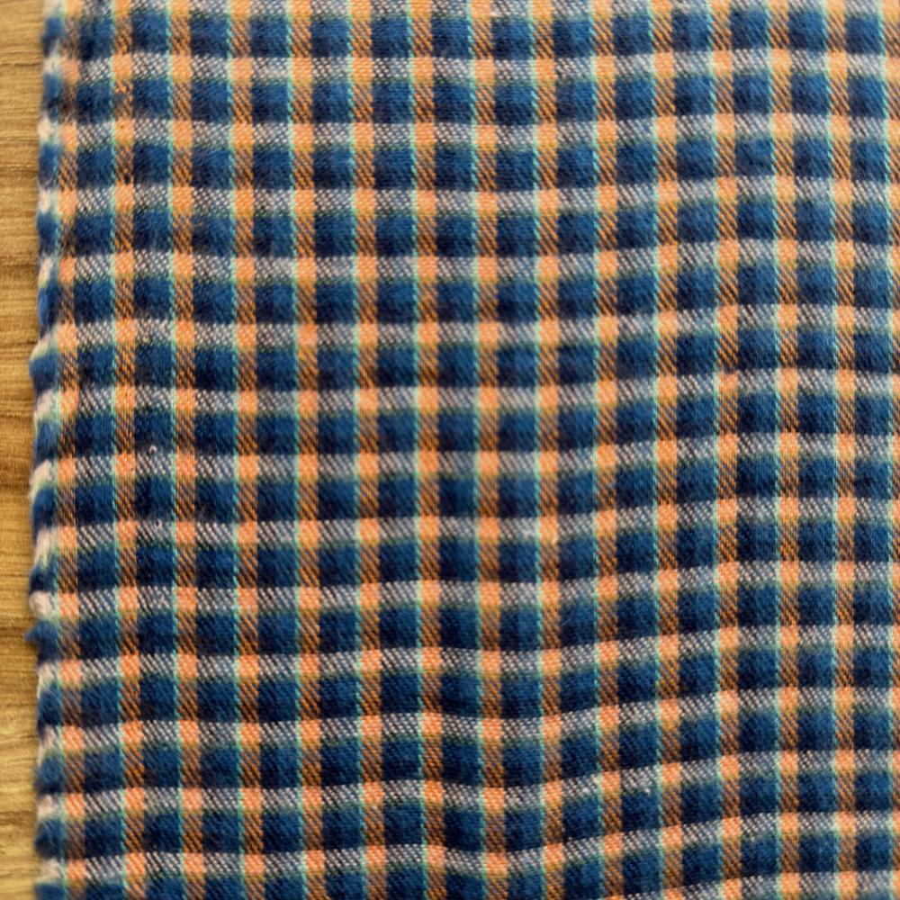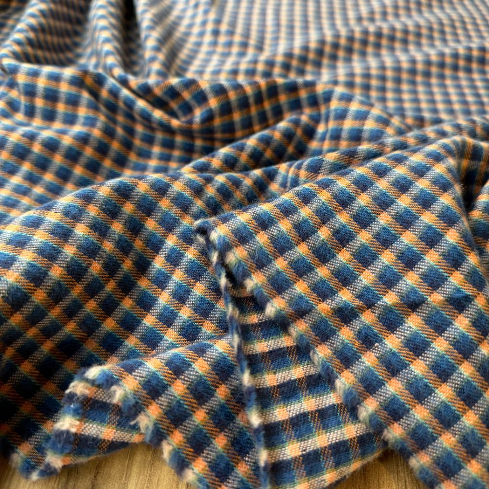 אריג כותנה פלנל משובץ קטן בגווני כחול/כתום. מתאפיין במגע נעים ומלטף ויוצר תחושה חמימה בגוף. מומלץ לפרטי לבוש ישרים עם תנועה כגון חצאיות ושמלות בשלל גזרות, מכנסיים עם גומי וחולצה מכופתרת.