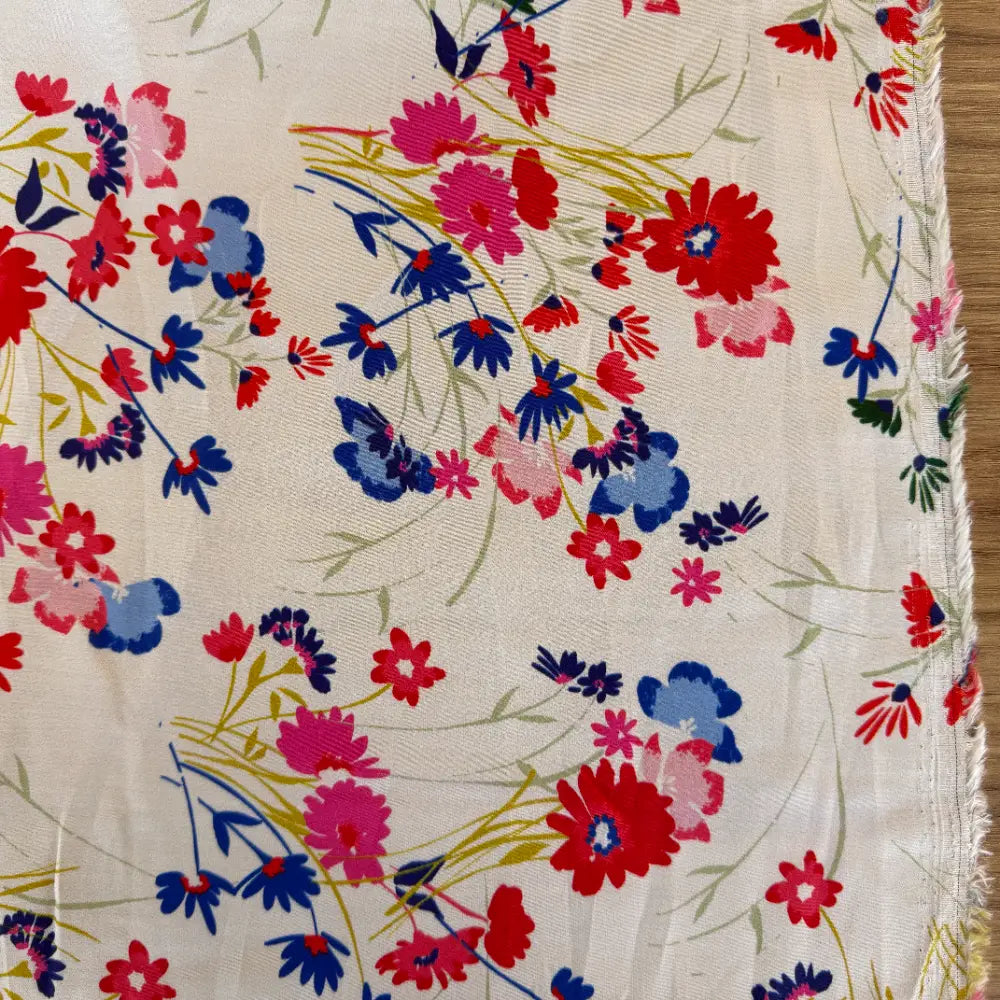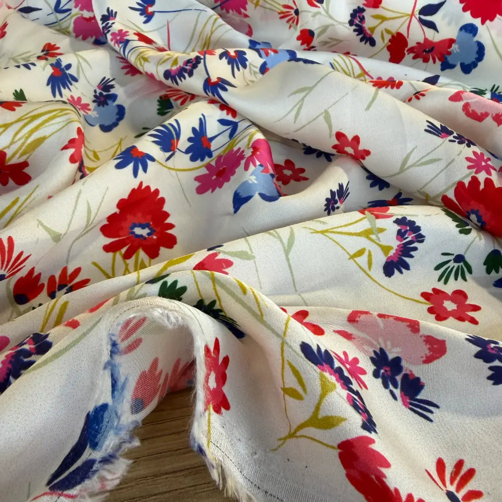 אריג ויסקוזה בהדפס פרחים קטנים ומרווחים בגווני אדום וכחול על רקע שמנתי. מתאפיין בנפילה מעולה ומגע רך ונעים.מומלץ לפרטי לבוש נשפכים וקלילים כגון חצאיות, שמלות, מכנסיים עם גומי, גלביות, עליוניות, בגדי חוף וחולצות מכופתרות.